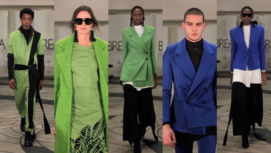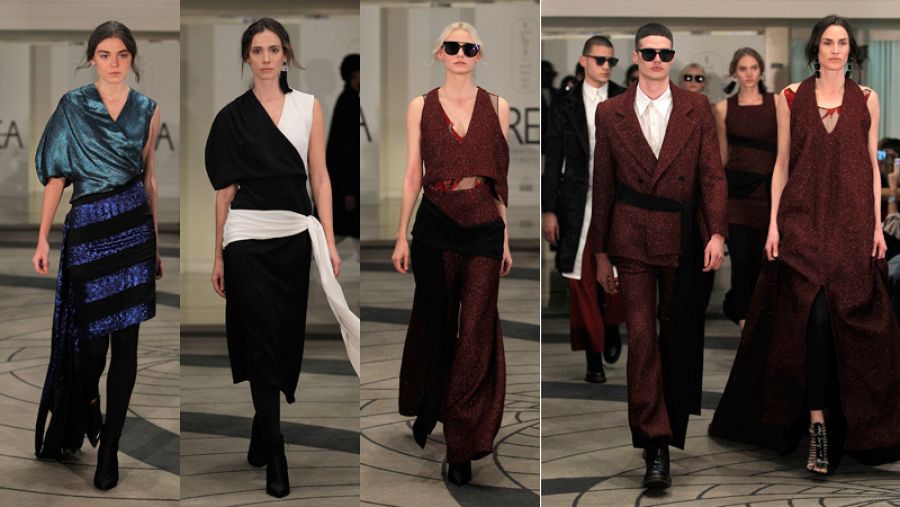 Después fue el turno de Juan Brea que colocó su pasarela en un profundo sótano del hotel Palace. Un guiño a las cámaras funerarias de las pirámides del antiguo Egipto, fuente de inspiración para el diseñador que ha dibujado una colección para mujeres y hombres sofisticados. Para ellas idea piezas realizadas con tiras de tejido que recuerdan a las vendas de las momias. Para ellos propone monos que tinta en un verde ácido prestado por el Nilo.