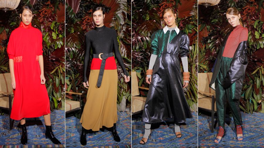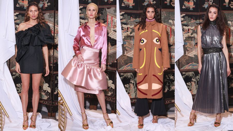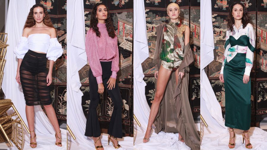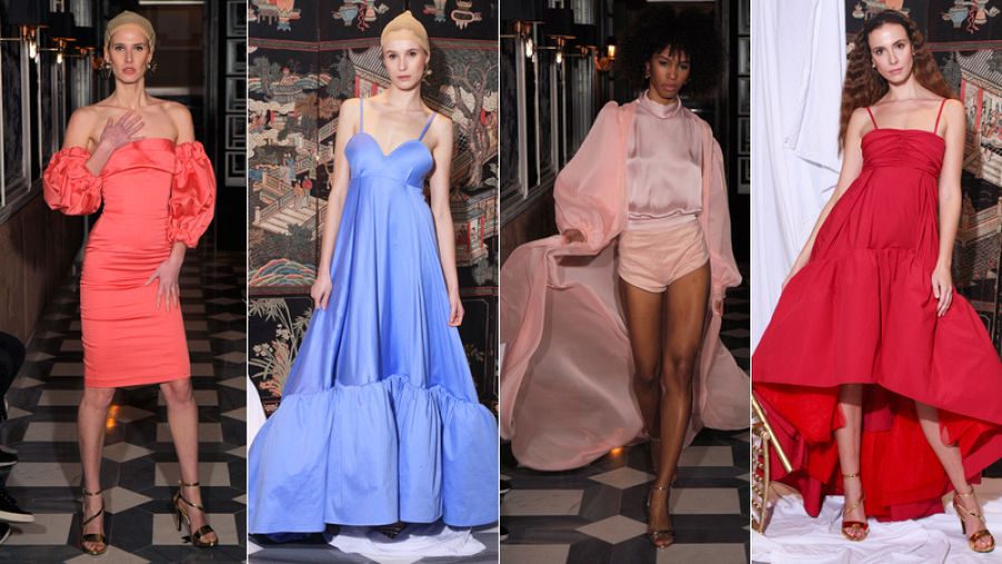 El desfile comienza con camisas superpuestas que casi se entrelazan formando una única prenda y pantalones campana. Satén, rayón, lúrex y moiré aportan brillo y un toque sofisticado a camisas, tops y faldas, casi siempre en tonos rosas y malvas. Destaca un vestido en lúrex plisado en plata vintage, un tanto setentero, pero también uno en licra que se aferra al cuerpo, con claro estilo ochentero.