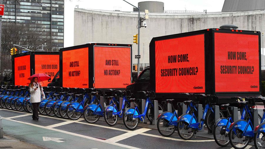 Inspirada por la película "Three Billboards Outside Ebbing, Missouri", una coalición de organizaciones médicas y humanitarias ha desplegado ante la sede de la ONU tres grandes carteles demandando al Consejo de Seguridad una acción urgente para aliviar la situación en Guta Oriental.