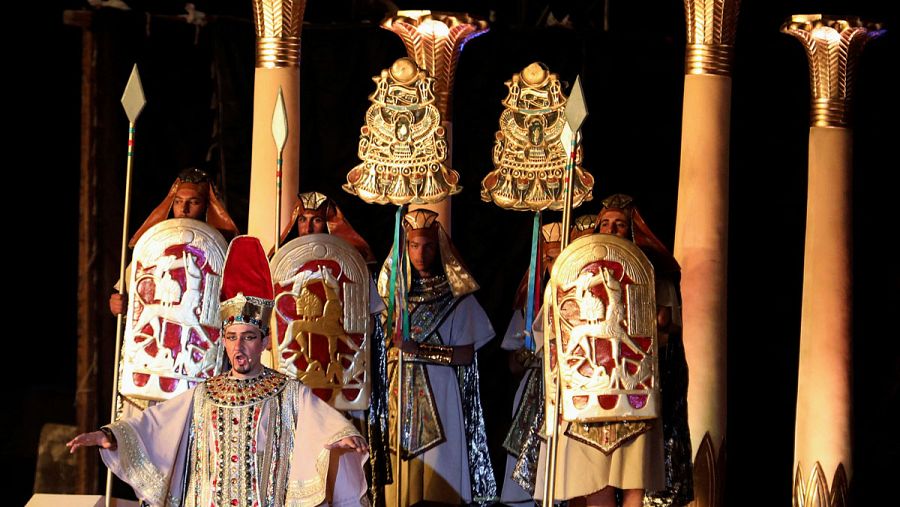 En un espectáculo exclusivo en el que las entradas oscilaban entre las 2.000 libras egipcias (113 dólares, 91 euros) hasta las 9.500 (540 dólares, 440 euros), se representó una de las óperas más famosas del repertorio de Verdi en la explanada de las pirámides, en el suroeste de El Cairo.