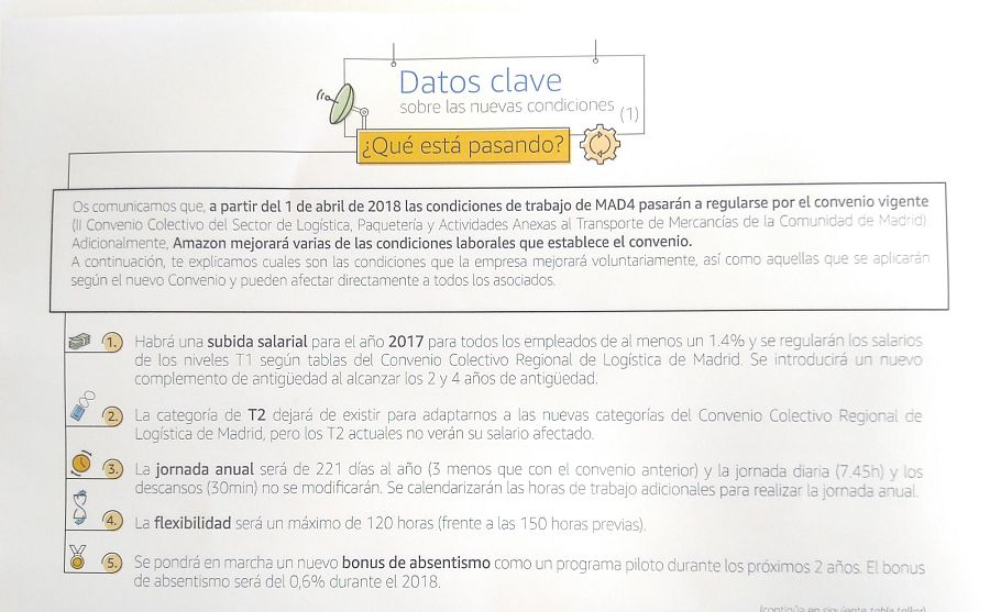 Ha sido este miércoles cuando los representantes de los trabajadores han recibido la comunicación oficial de Amazon de que, a partir del 1 de abril, se les aplicará de forma unilateral el convenio sectorial. Un convenio que supondría la congelación de algunos sueldos, la equiparación de una categoría intermedia a una inferior, reducción del 75% de los complementos por baja común, del precio de las horas extraordinarias, las nocturnas y las del fin de semana, entre otras cuestiones.