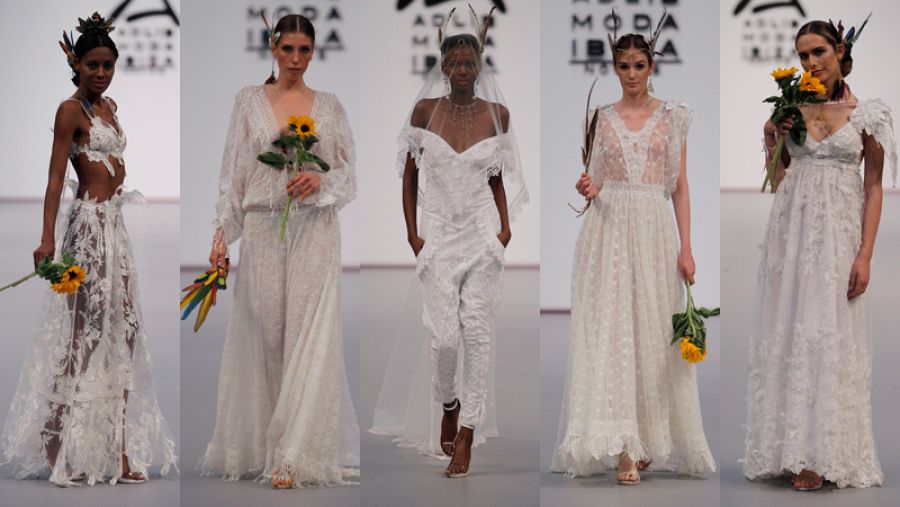 Bonet ha colaborado con Elisa Pomar para las joyas y con Head Wings Ibiza para los tocados de plumas y con Hysteriamachine para los que van sobre los velos. Tradiciones, artesanía y talento con ese sello tan especial que tiene la moda AdLib.