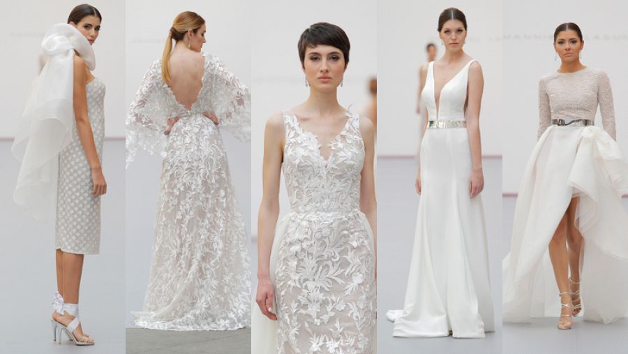 Destacan los vestidos etéreos, ligeramente marcados en la cintura, que llevan la espalda al descubierto y colas que parecen una sobrefalda que, como cuenta Laguna, “ahora se presentan como majestuosas faldas velo, el sello de la firma”.