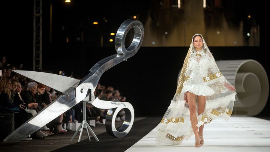 Primero cayeron del cielo unas tijeras enormes, después bajó un dedal gigante con Madeleine Hjört, Godeliv y Marta Español en su interior y luego descenció un grandísimo acerico, con sus agujas y alfileres, sobre el que bailaba un grupo de chicas sujetas con arneses. Entre una acción y otra salían las modelos a la pasarela que lucieron hasta 80 vestidos diferentes, diseños de Yolancris que hacen guiños a divas de los 80 como Madonna o Grace Jones pero también actualizan iconos históricos de la moda, con sentidos homenajes a Balenciaga, Saint Laurent o Lacroix.