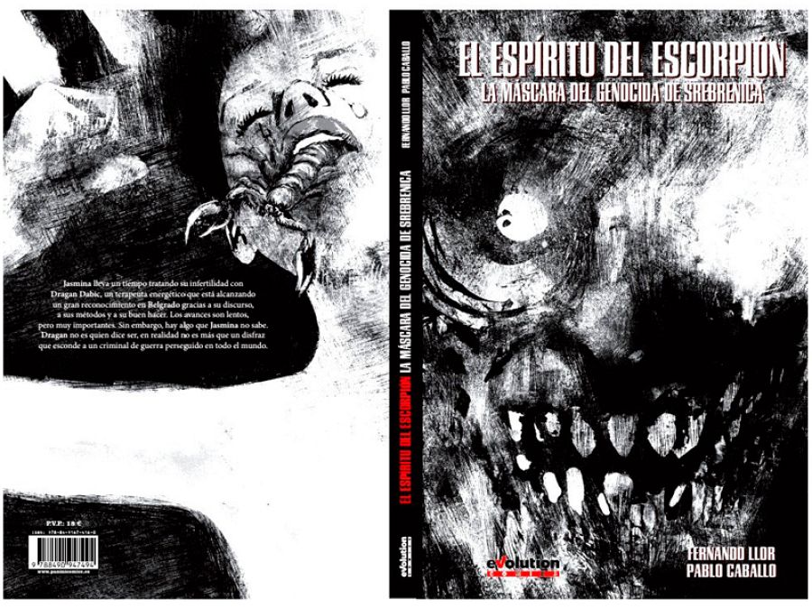 Destacar esas poderosas imágenes de la portada y la contraportada. “Para la portada –asegura Pablo- la idea inicial y primera versión era mostrar el rostro de Karadzic/Dabic partido por la mitad a modo de dos caras, aprovechando un escorpión que se arrastraba por su cara y dibujaba una sonrisa loca en la expresión de Karadzic. Como la composición me resultaba un poco confusa y el escorpión me parecía que no acababa de distinguirse. Realicé otra versión, esta vez a color y ya sin el escorpión. Esta versión nos gustó mucho más a Fernando y a mí pero el tema del color no acabábamos de verlo del todo claro. Acabé realizando una tercera versión mucho más loca y deformada, en la que ya no se distinguen tanto las dos caras diferenciadas pero que resultaba mucho más potente y que acabó siendo la versión definitiva”.