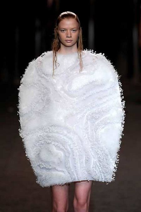 “Vemos las prendas como las pieles de los edificios y ciudades y queremos difuminar ese límite para que se pueda interactuar con el entorno, cubres tu cuerpo con materiales que se usan para proteger las casas del frío o del calor”. Las prendas juegan a emparejarse y desencontrarse. Por ejemplo, un vestido realizado con conchas de mejillón y otro con las pequeñas esculturas que se han hecho en ellas, utilizar los moldes y las figuras.