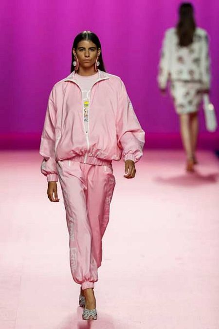 Vemos un chándal de rayas texturizado y otro transformado en una bomber y un short de lujo. Hay uno en rosa de patrón generoso, otro en punto de lúrex negro y dorado, otro en blanco con las nenas estampadas, otro convertido en una chaqueta de cuadros con volantes y falda de tubo, otro en rojo intenso sobredimensionado con volantes gigantes que caen por las mangas y los pantalones y hasta uno de novia en tafetán de seda, con flores aplicadas y cadenas de perlas y cristal. Puro glamour urbano.