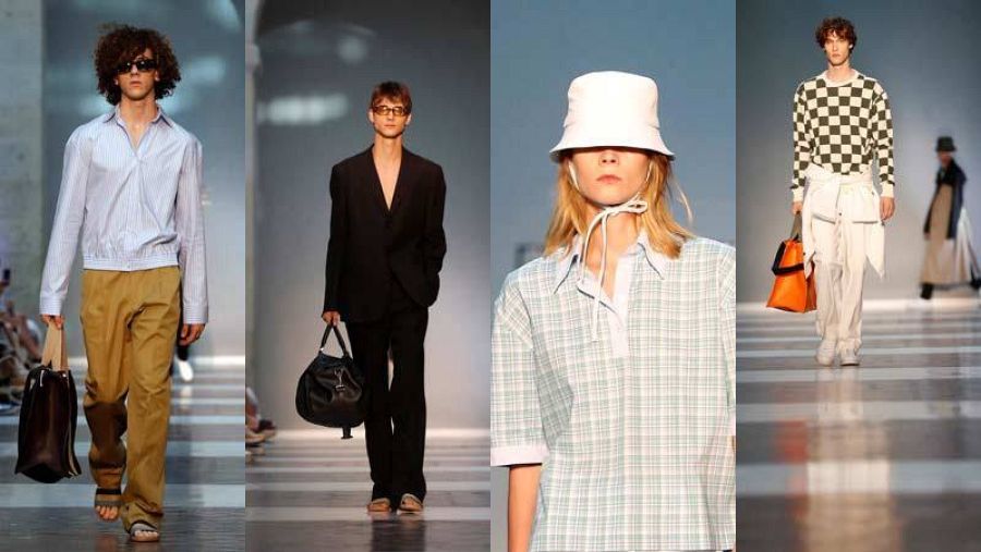 Los pantalones también se agrandan, tanto los largos como las bermudas que vemos en distintos estilos y texturas, aunque destacan unas cargo con bolsillos superpuestos. Los tejanos llevan bolsillos dobles, por delante y en el lateral. Los desflecados cuelgan de algunas prendas, otra forma de enfocar ese aire ‘a medio terminar’. Los polos llevan rayas y elástico en el bajo y los trajes también tienen patrón cómodo. La casa los presenta en lino “con los interiores muy cuidados, realizados con tejidos técnicos”. Sobre la pasarela destaca un traje en lino verde que se lleva sobre un chubasquero que lleva una trama de cuadrados en tamaño pequeño. “Todo gira en torno a ese concepto de enfrentar lo natural y lo artificial”.