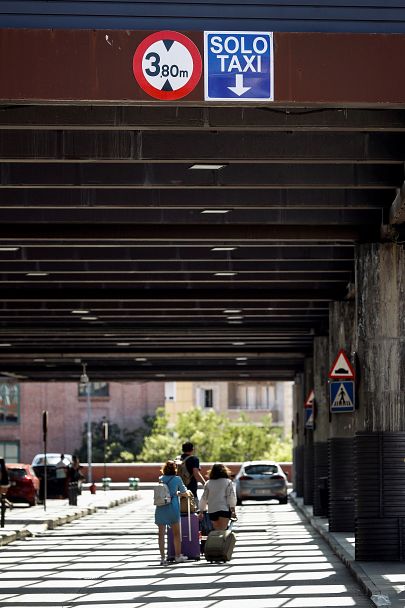 Varios turistas caminan por el carril de taxi de la estación de tren de Atocha, donde los taxistas permanecen en huelga. EFE/EMILIO NARANJO EFE