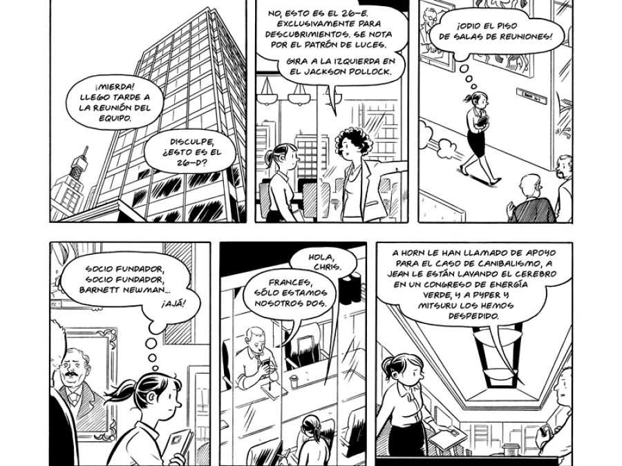 Sin olvidar sus estupendos y sencillos dibujos, muy expresivos y que oscilan entre la naturalidad y lo caricaturesco (como ese socio de la empresa cuyo gigantesco tamaño hace que nos recuerde a un mamut).