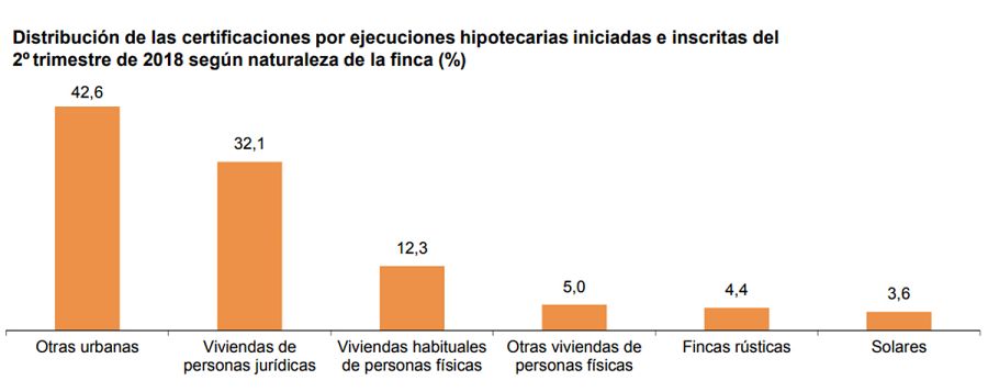 Por su parte, las ejecuciones hipotecarias de otras fincas urbanas (locales, garajes, oficinas, trasteros, naves, edificios destinados a viviendas, otros edificios y aprovechamientos urbanísticos) suponen el 42,6% del total.