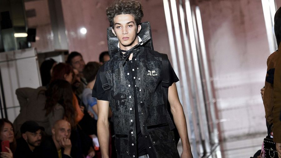 Diseño para hombre de la casa Courrèges que conecta con el trabajo que la casa hizo en los años 60. AFP