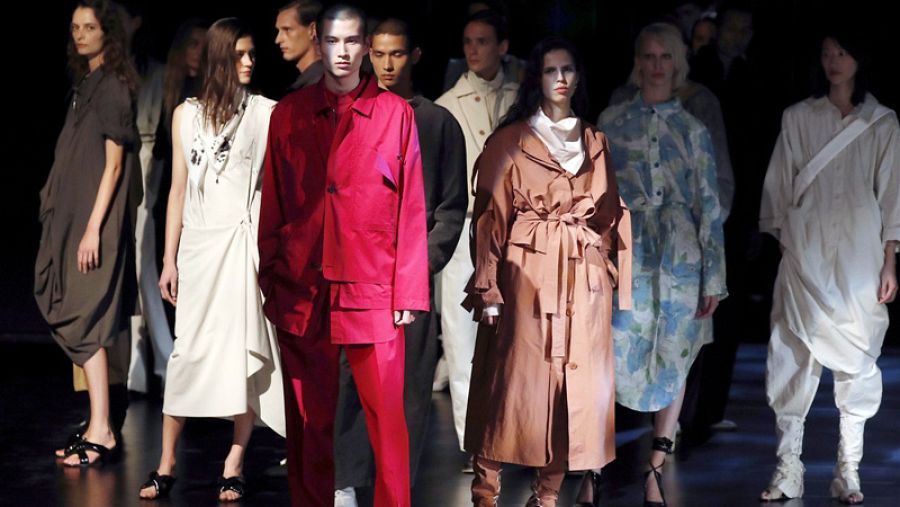 La deconstrucción del patrón y el estilo andrógino y unisex recorren la propuesta de Maison Margiela. AFP