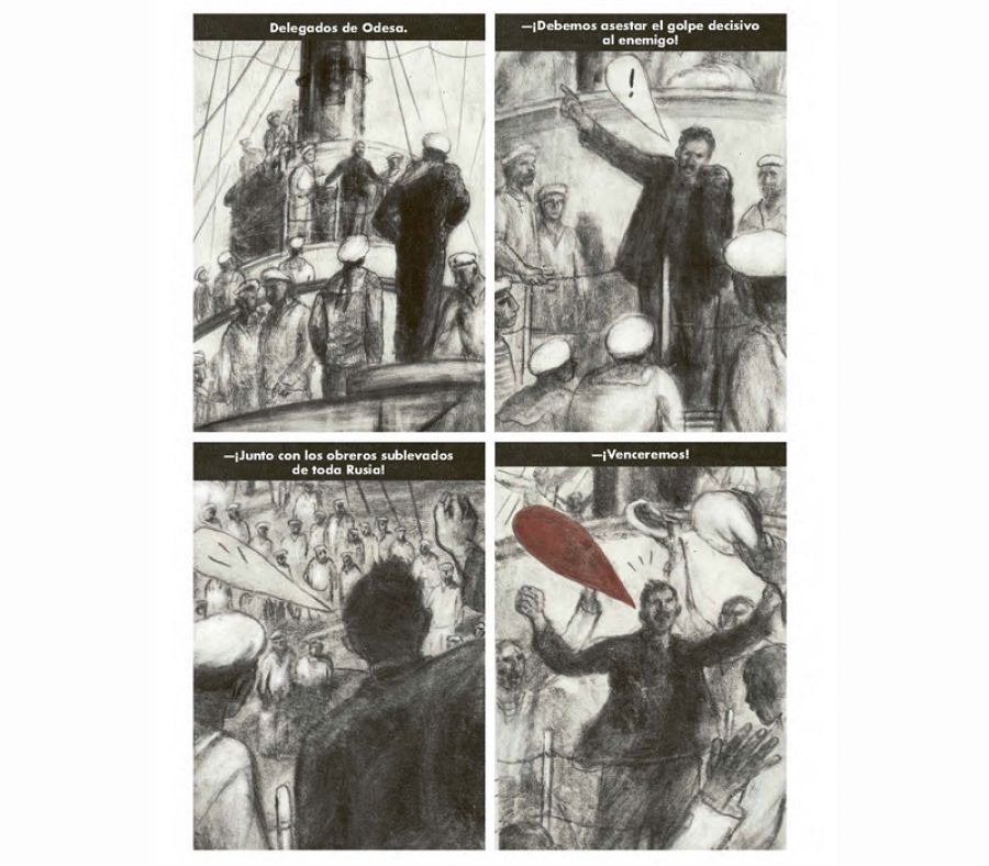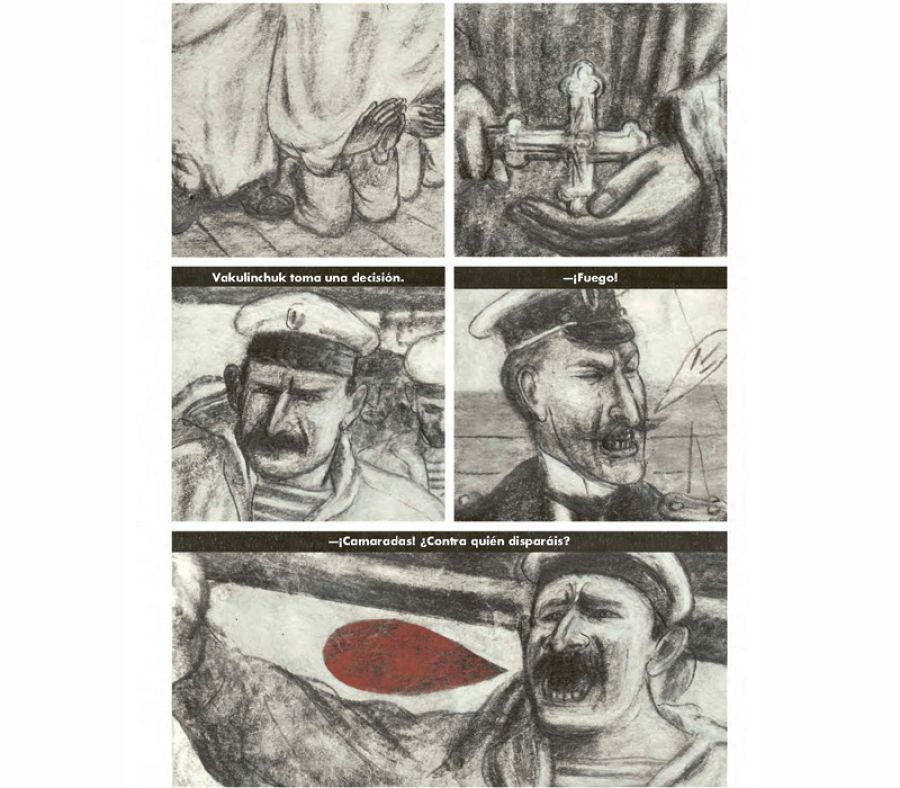 Aun así el cómic tiene algunos toques de color rojo. “Me los pidió mi editor y también aproveché que Eisenstein tiñó de rojo la bandera, en la película original, para ponerlos¡ también en otros sitios; como cuando aparece la sangre del mártir, de Vakulinchuk, los globos donde aparecen los parlamentos más revolucionarios, etc…”