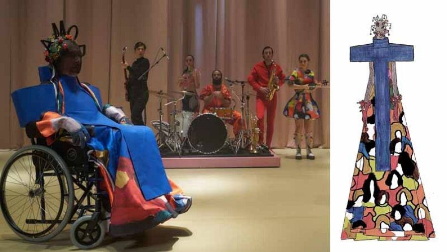 Los brochazos de color y el patchwork de texturas aportan una fuerte carga dramática a las piezas que conviven con otras más sencillas como los monos, que vemos en blanco o en naranja fuerte con aplicaciones de flores. Hay prendas lenceras, frágiles, que contrastan con otras como el traje de hombre, simbolo de la dominación y el machismo. Los estampados tienen un gran protagonismo y algunos incluyen palabras con intencionalidad y textos de la obra. "Como un mono naranja de un preso con la palabra 'libre' que expresa esa dualidad", cuenta.