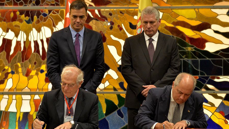 El jefe del Gobierno español, Pedro Sánchez, y el presidente de Cuba, Miguel Díaz Canel, han presidido este jueves la firma de un memorándum por el que ambos países acuerdan contactos políticos permanentes con reuniones anuales en las que se hablará de todo lo que consideren oportuno, incluidos los derechos humanos.