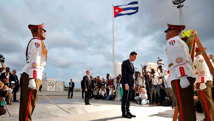 Acompañado por militares cubanos y el vicecanciller Rogelio Sierra, Pedro Sánchez presentadaba sus respetos con una corona de flores frente al monumento dedicado al héroe nacional del país caribeño, conocido como el "apóstol de Cuba", tal y como establece el protocolo para las visitas de alto rango.