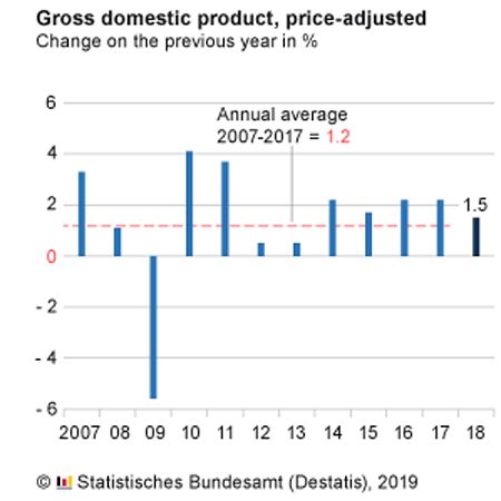 Alemania creció un 1,5% en 2018, según los datos provisionales de la Oficina Federal de Estadística (Destatis). Se trata del noveno año consecutivo de crecimiento de la mayor economía europea, pero de su menor tasa de incremento del Producto Interior Bruto (PIB) desde 2013 (cuando fue de un 0,5%) debido a la desaceleración experimentada en el segundo semestre.