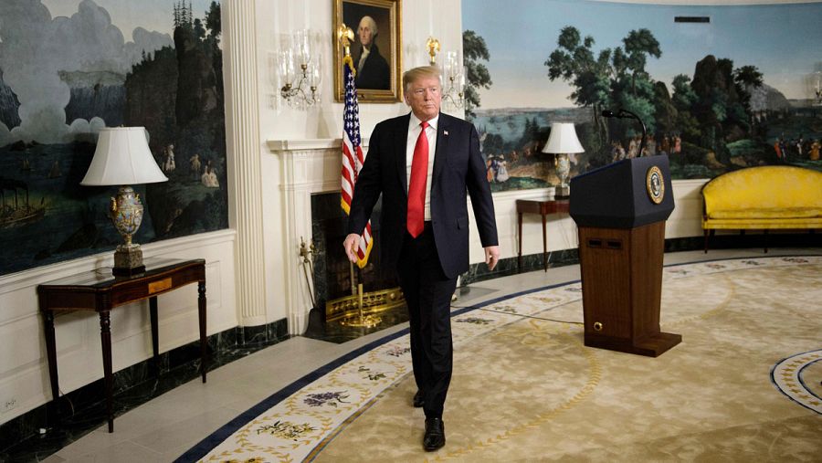 Trump abandonando la sala tras su alocución.
