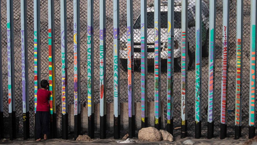 Un niño mirando desde el lado de México a unos guardias fronterizos estadounidenses.