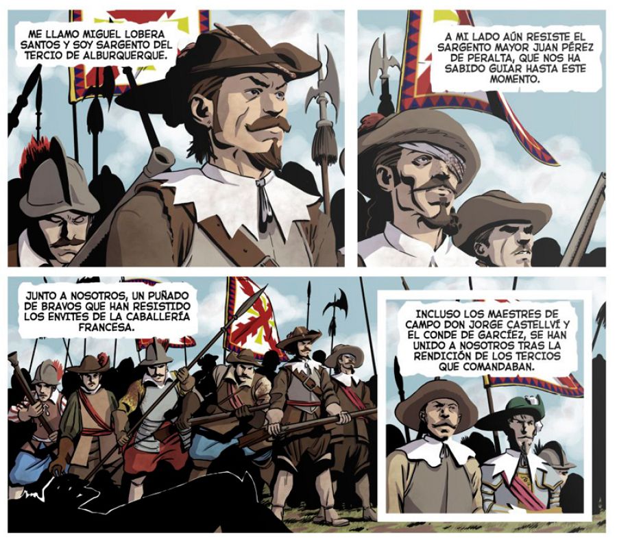 Los Tercios españoles fueron el primer ejército moderno europeo, formado por voluntarios profesionales, en vez de pobres reclutados contra su voluntad o mercenarios contratados. Ellos son los protagonistas de esta historia. “En 1643: Rocroi, Román y yo los retratamos como soldados, simple y llanamente –asegura Roberto-. No creo que ninguno tuviera alma de héroe. Solamente trataban de llevar a su bolsa unos cuantos escudos, que por cierto se les adeudaba en bastantes ocasiones. Más allá de eso, la camaradería tras pelear con los mismos compañeros durante largas campañas, daba pie a un lógico compadreo entre dichos soldados, que en batalla les hacía pelear por evitar que esos camaradas pudieran diñarla”.