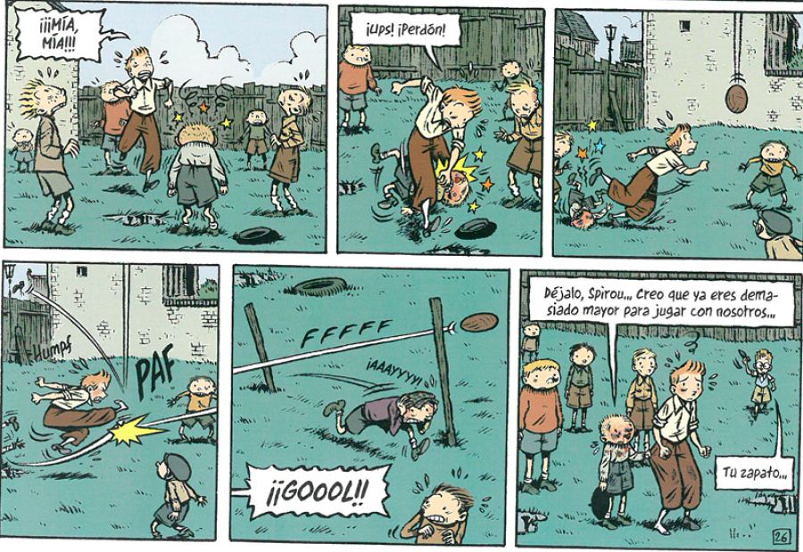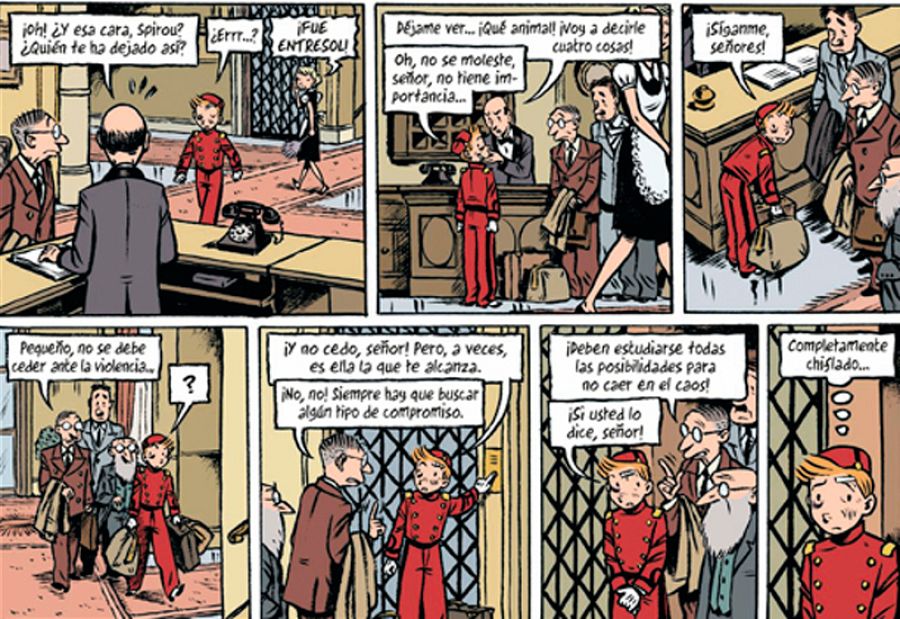 Y, por supuesto, estaba el tema de por qué un simple botones se convertía en un héroe. "Al responder esas preguntas -afirma Émile- me di cuenta de que conseguiría la historia del génesis del personaje de Spirou y descubrir cómo un botones se vuelve un héroe. Porque no parece que el trabajo de botones sea el más heroico ni que te desarrolle demasiado intelectualmente. Y por eso hice esa historia que muestra al personaje como un niño que se rebela. No lo he tomado como un superhéroe del cómic sino como un muñequito llamado Spirou, con el que he hecho mi historieta".
