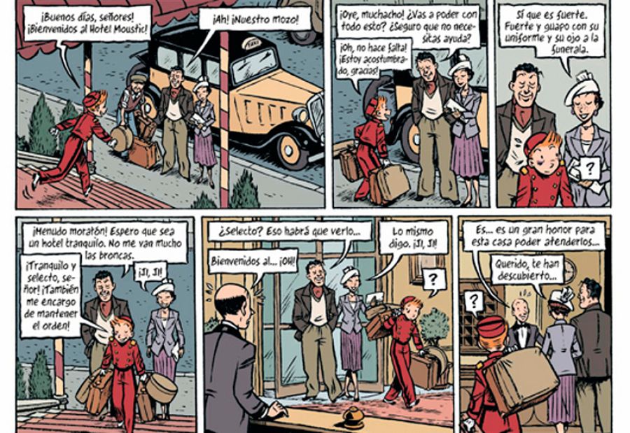 El cómic comienza con un breve episodio de la infancia de Spirou en el orfanato, que sirve como prólogo de la llegada del jovencito al hotel Moustic, donde descubriremos las respuestas a todas esas preguntas que nos planteaba Émile. Incluyendo el por qué siempre va vestido de botones, que incluye un divertido homenaje a Tintín.