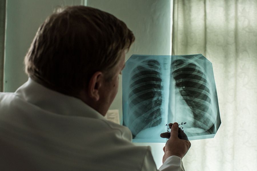 Viktor Zykov, asistente de laboratorio de rayos X del hospital de Zhytomyr, observa una radiografía de los pulmones de un paciente. OKSANA PARAFENIUK