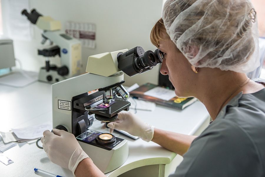 Una bióloga analiza una muestra para realizar un recuento de glóbulos blancos. OKSANA PARAFENIUK