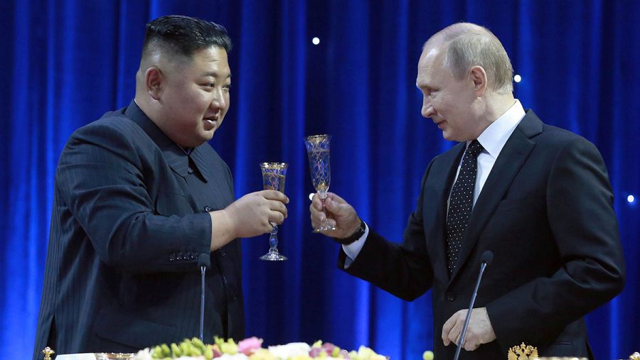 Kim y Putin brindando en la recepción oficial.