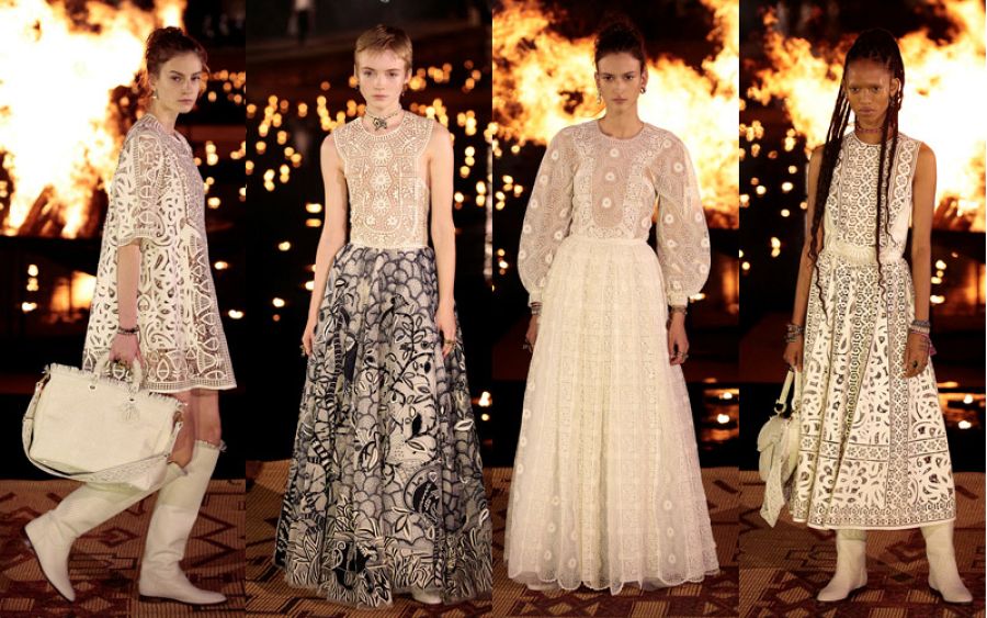 El encaje cobra una nueva dimensión en esta colección, abandonando su estilo afrancesado para abrazar una estética más étnica. Chiuri los superpone para formar volantes plisados. La paleta de color es evocadora y sensual. La gasa y el shantung de seda se tintan de tonos crudo, tostado y ocre pero también de vivos rojos y azul índigo.