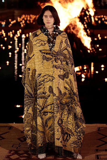 Conjuntos de prendas con distintos estampados contrastan con otros en tonos lisos, y piezas como el caftán rivaliza con monos en denim o prendas de carácter deportivo, como los canguros. Los flecos recorren la colección, en tamaño grande en prendas de día o en tamaño mini para los ribetes de los escotes de los vestidos de noche.