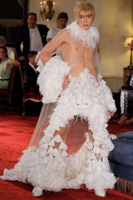 Junto a ellos se muestran prendas de cinco jóvenes creadores, entre ellos Palomo Spain, que destacan por su moda osada y sensible pero también potente, un arma imprescindible para derribar romper con barreras y tabúes.