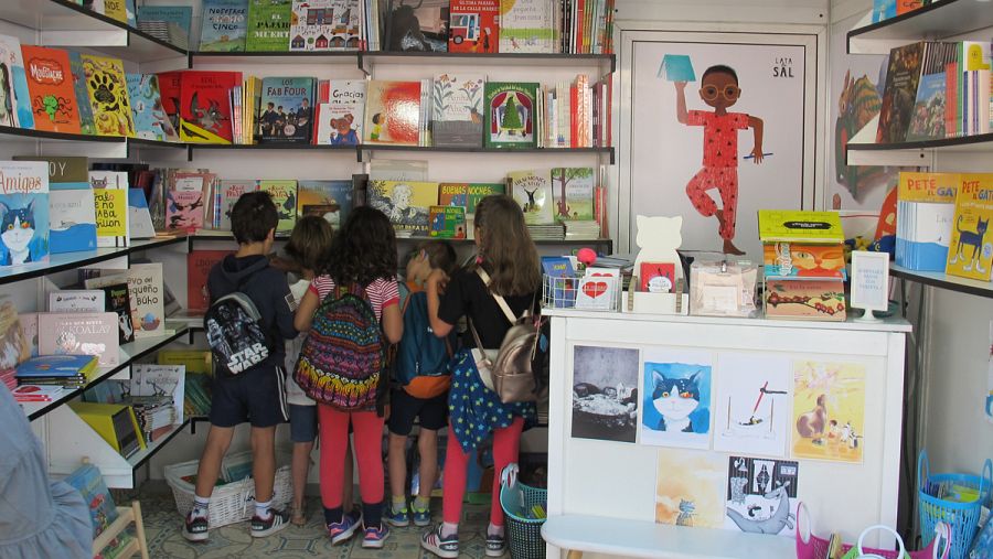 Niños en la caseta de la editorial Lata de Sal