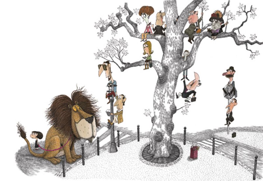 También, en ocasiones, introduce ricas intertextualidades con personajes de los cuentos clásicos y tradicionales para crear distintas capas de lectura. Un sinfín de texturas literarias donde el sentido se pone a prueba, una y otra vez, para saborear las posibilidades de la ilustración, sin perder, jamás la sonrisa.