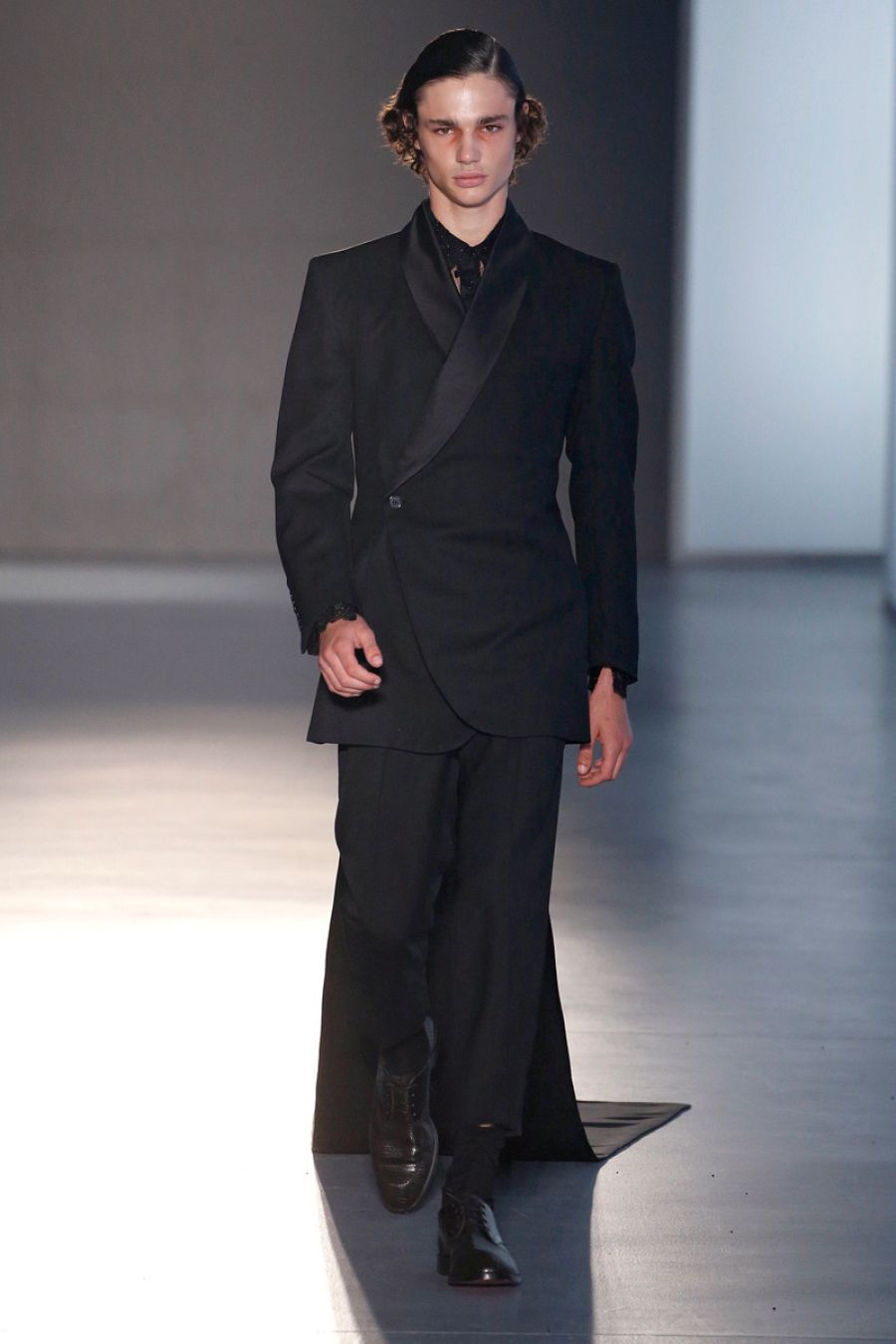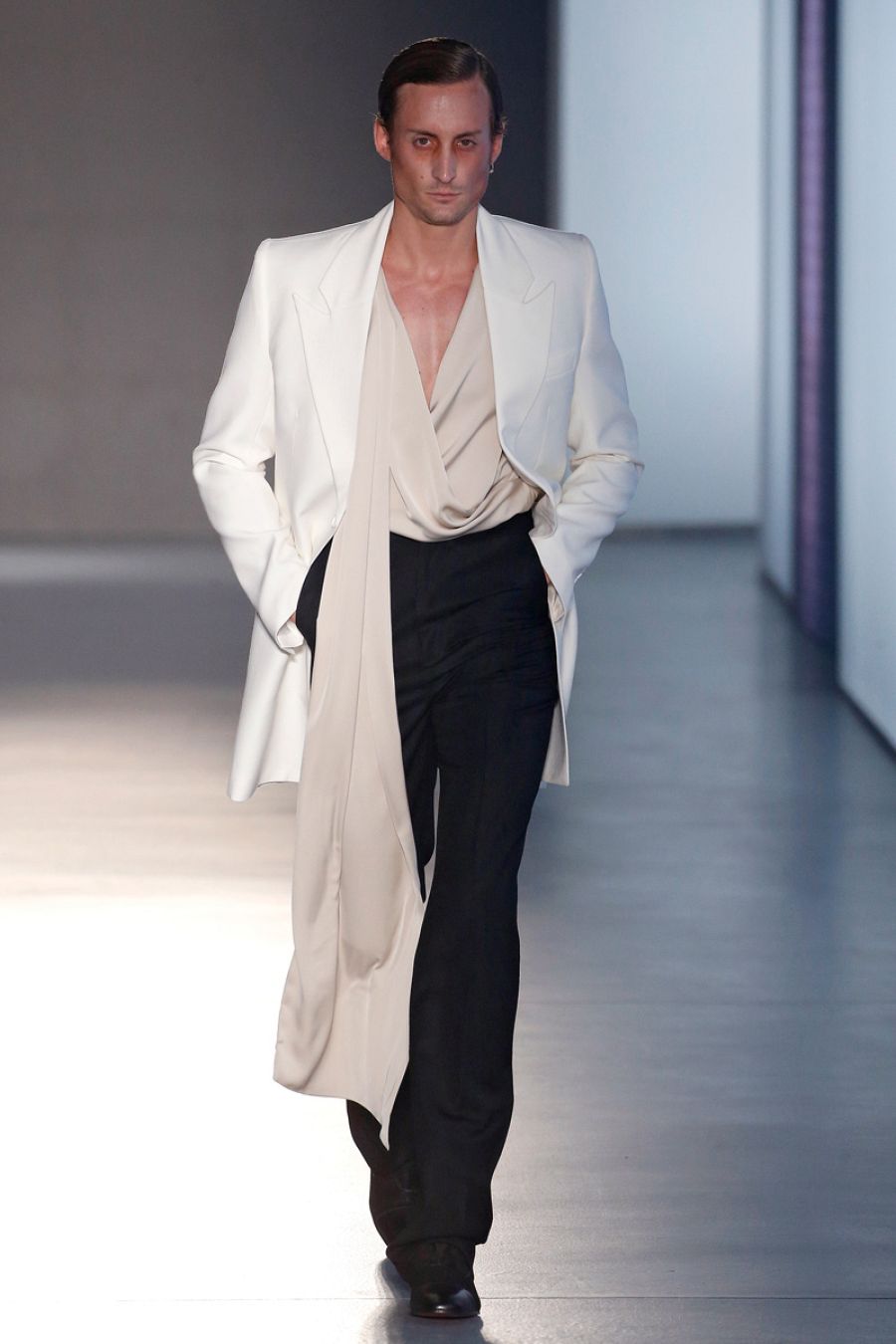 Para la noche se reserva muchas sorpresas. Los trajes, siempre de dos piezas, llevan drapeados en las mangas y los pantalones o potentes estampados en blanco y negro. Hay uno en raya diplomática que lleva una manga 'fantasía' con lentejuelas. Los esmóquines, osadamente modernos, levantan los aplausos a su paso. Los vemos en blanco roto con la solapa en raso de seda blanco, siempre con el patrón cruzado, y otro lleva un pantalón del que cuelga una cascada de flecos de azabache. Para terminar, un esmoquin del que sale una cola de tres metros que el modelo arrastra con solemnidad. Sin palabras.