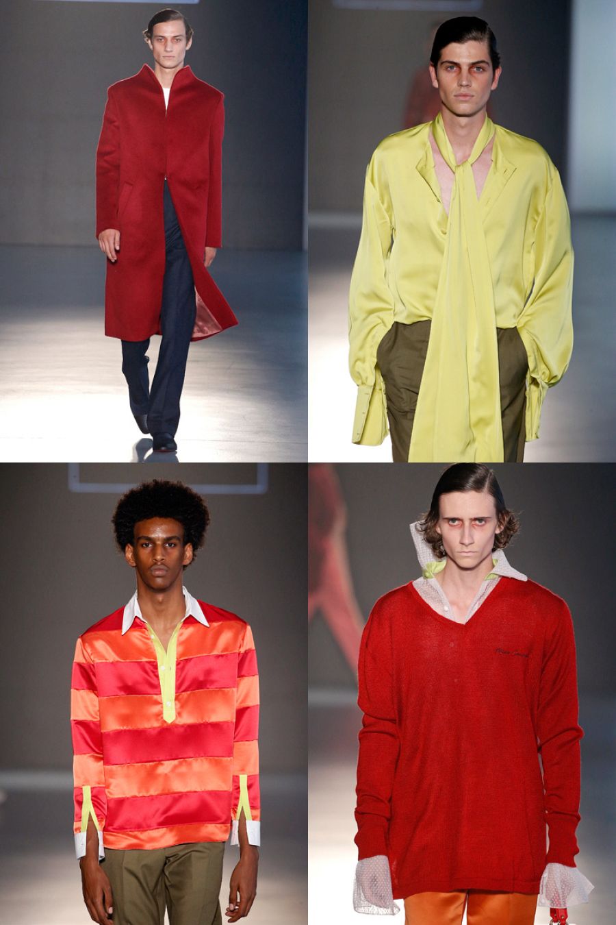 Hay piezas muy atractivas, como su version del típico polo de verano que pierde todo su aire deportivo cuando el sevillano lo hace en seda de dos colores, borgoña y naranja, y lo decora con una sardineta amarilla y un cuello blanco, ambos de popelín. El punto también llaman la atención y vemos un jersey en rojo que lleva la espalda abierta, igual que el abrigo de cuello chimenea. Esta prenda se desarrolla con pasión en toda la colección, desde la primera salida. Sus abrigos tienen mucha presencia y aportan un plus de elegancia a las prendas que acompañan. En contraste, Álvarez hace una cazadora perfecto en piel de potro porque las temporadas ya no son lo que eran. Y quizá en el norte de Europa sí la puedes llevar.