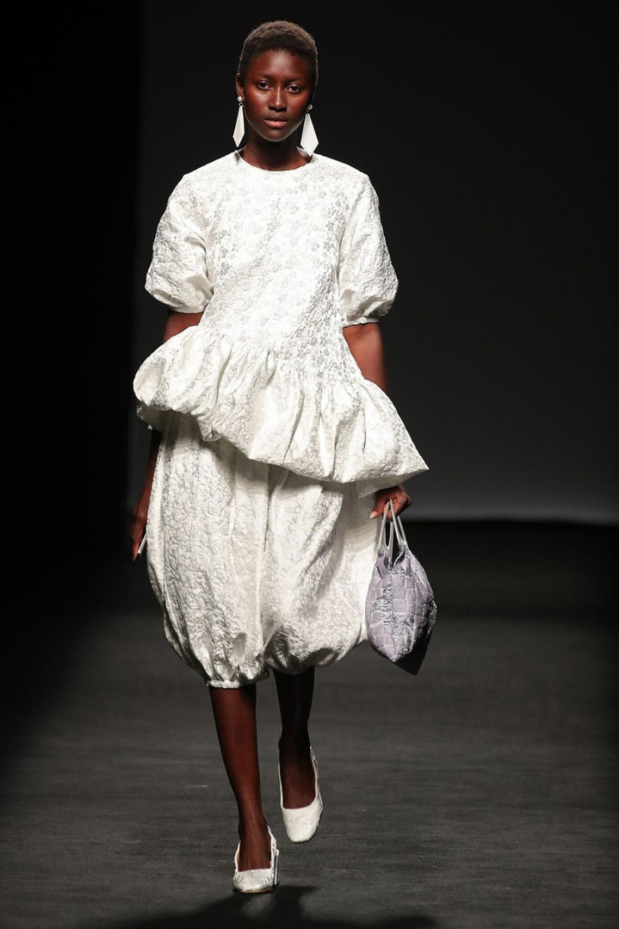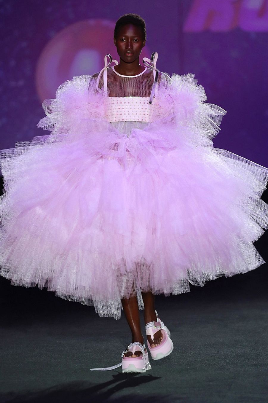 Hay brocados con hilo de lúrex en vestidos de volantes de Aute Cuture, que suena en la pasarela. Son volantes que forman parte del universo estético de Rosalía. plásticos holográficos, gabardinas plastificadas, organzas técnicas... Con este último hace un vestido fabuloso con un nido de abeja tridimensional que crea un volúmen generoso. Un vestido que era su opción para el cierre nupcial pero ha dudado y ofrece dos. El otro es un vestido palabra de honor con un enorme lazo en el escote que está hecho en un plástico que refleja todos los colores.