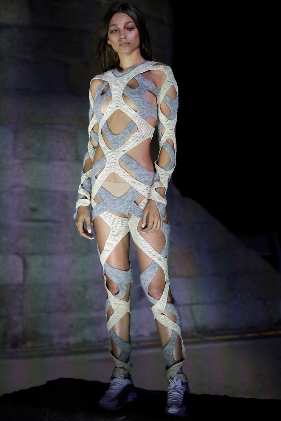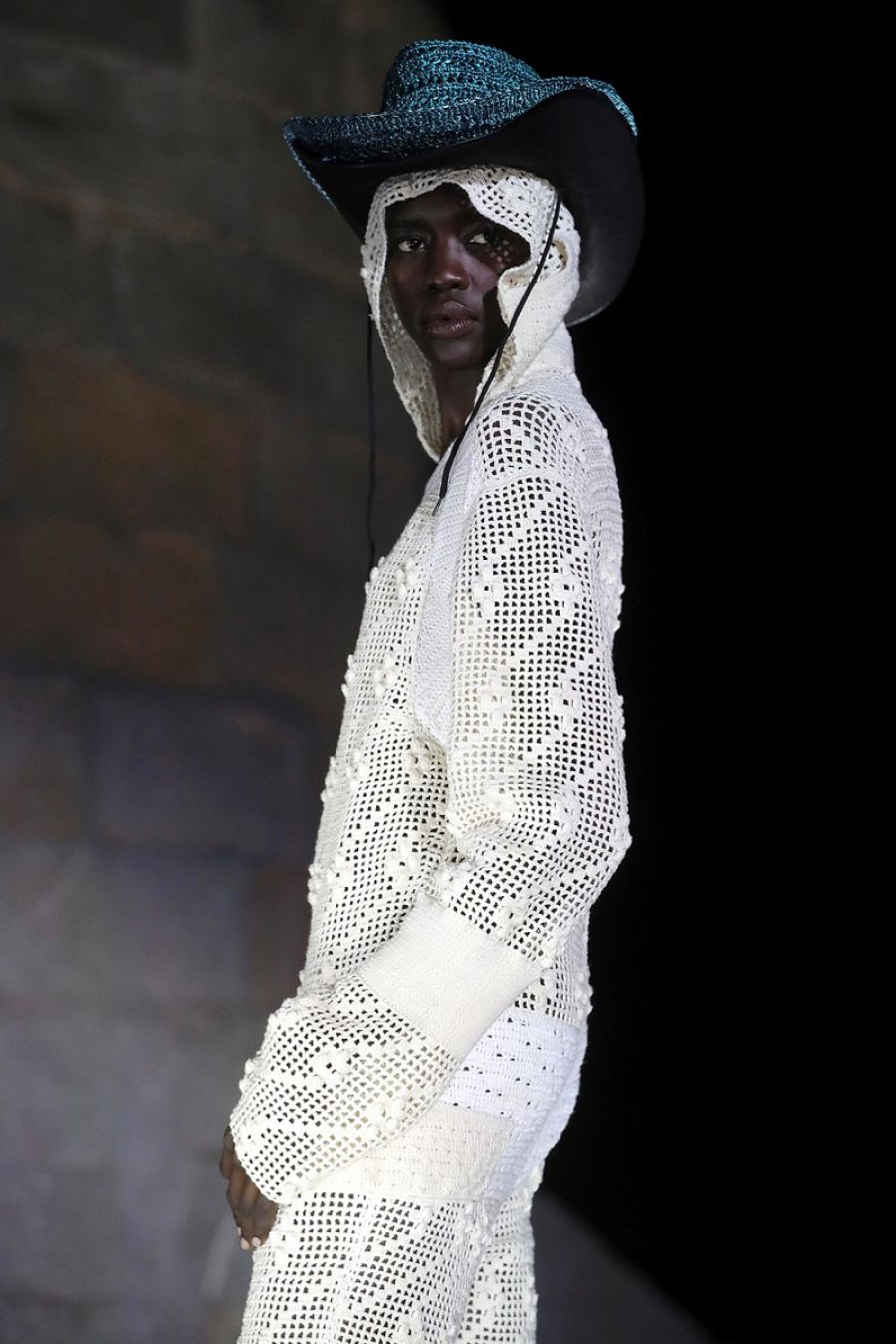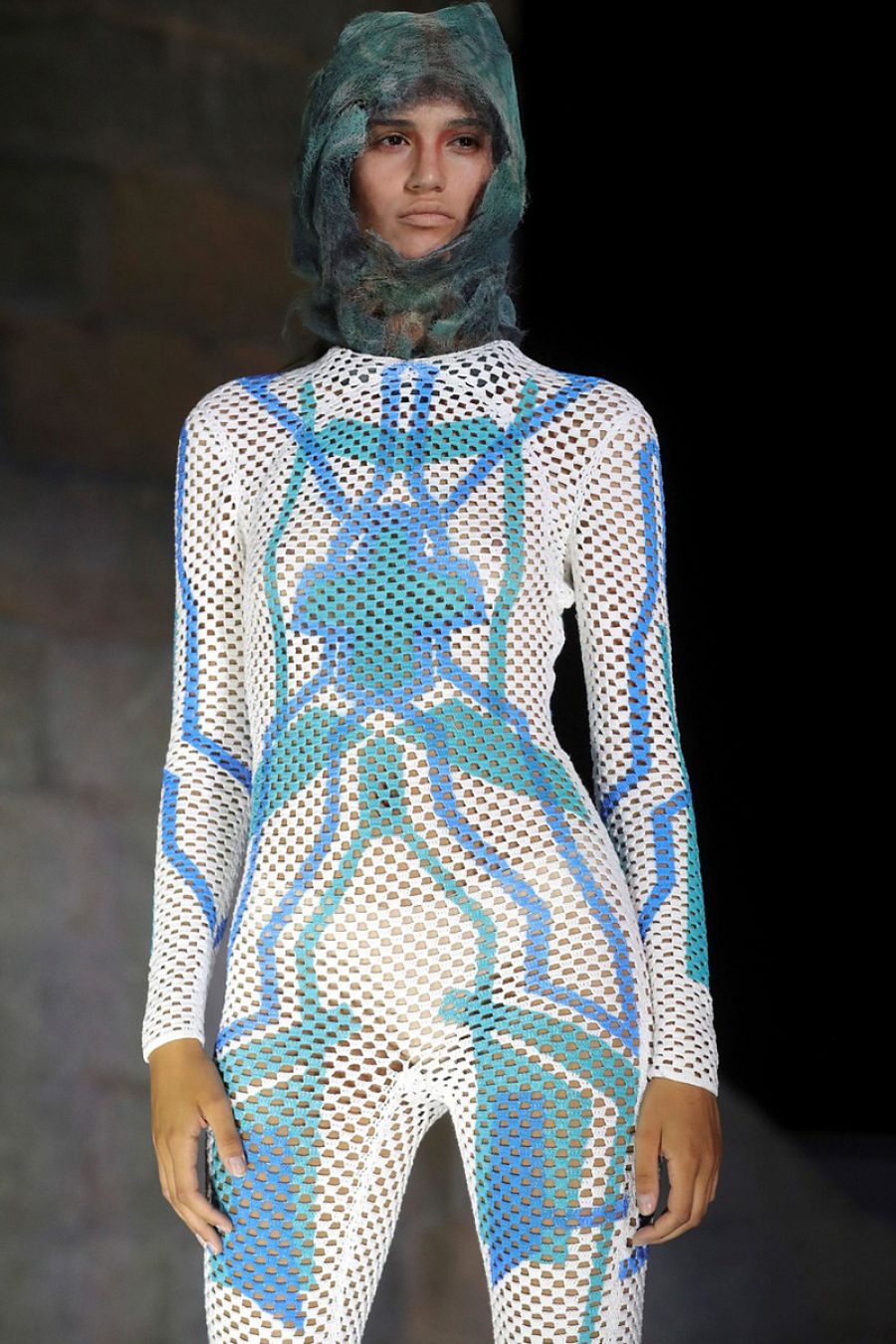 Todos son monos y cada uno está hecho con un tipo de lana. “Este está hecho entero con mohair, este que parece un pijama cowboy es de ganchillo, este es de lana merino 100%, este lleva hilo de poliamida, este lleva rafia tricotada, este es de peluche…” Destaca dos prendas. Por diferentes motivos. Una de ellas es un patrón plano que la modelo lleva colgado sobre el cuerpo sujeto con unos piercing. La otra es una pieza muy especial que por delante es una capa y por detrás un mono.