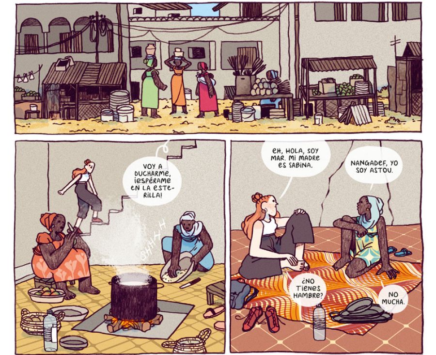 Un relato en el que narra el viaje de una adolescente europea a Senegal para acompañar a su madre, que trabaja en el proyecto de construcción de una biblioteca y una emisora de radio. Y que, a medida que se adapte a la vida allí, descubrirá una cultura fascinante y hospitalaria, en la que sobran casi todos los excesos del mundo moderno. Destacar los dibujos de Núria y su excepcional manejo del color, con el que logra transmitirnos la belleza del paisaje de Senegal y de sus gentes. Un cómic que nos deja con las ganas de viajar, aunque de una forma responsable, olvidándonos de los prejuicios y prestando atención a las relaciones humanas y a las cosas realmente importantes de la vida.