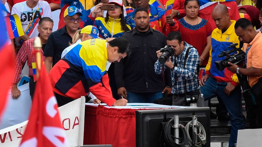 El mandatario venezolano firmando un documento contra el bloqueo.