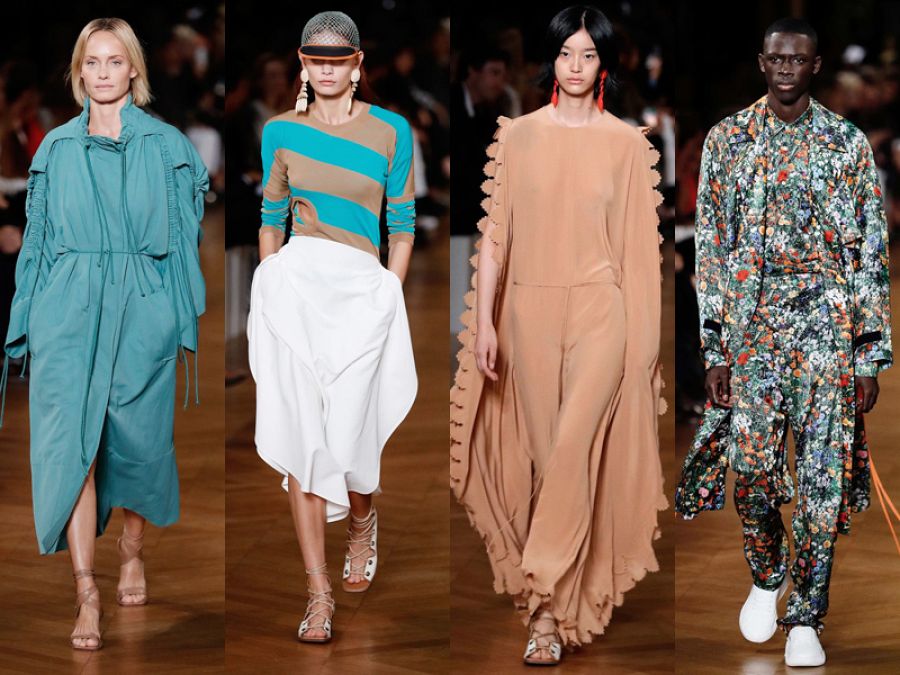 Vemos chaquetas largas de corte recto, pantalones bombachos, gabardinas por debajo de la rodilla marcadas en cinturas y mangas mediante cuerdas, monos de pata ancha, faldas midi y largos caftanes con discretos volantes o brocados étnicos. Los colores van desde los suaves y neutros hasta los más potentes tonos de naranja y azul. Una paleta natural con una clara sintonía con el medioambiente.