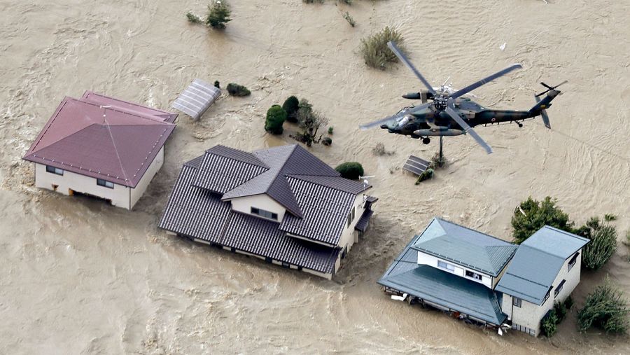 La cadena pública NHK ha difundido desde primera hora de este domingo imágenes de áreas residenciales inundadas por desbordamientos fluviales y de las labores de rescate.