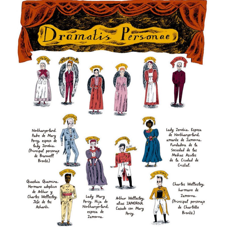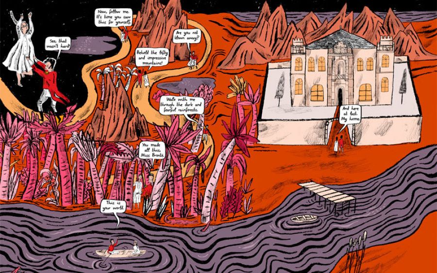 Y es que Isabel Greenberg mezcla las historias y personajes que las hermanas Brontë crearon para esa Ciudad de Cristal, con la biografía y las vivencias de las jóvenes, creando un universo en el que la realidad y la ficción se mezclan de una forma realmente apasionante, en uno de los ejercicios metaliterarios más apasionantes que hemos visto recientemente. Por ejemplo, asistiremos asistiremos a una emocionante charla entre Charles Wellesley y Charlotte Brontë (su creadora).
