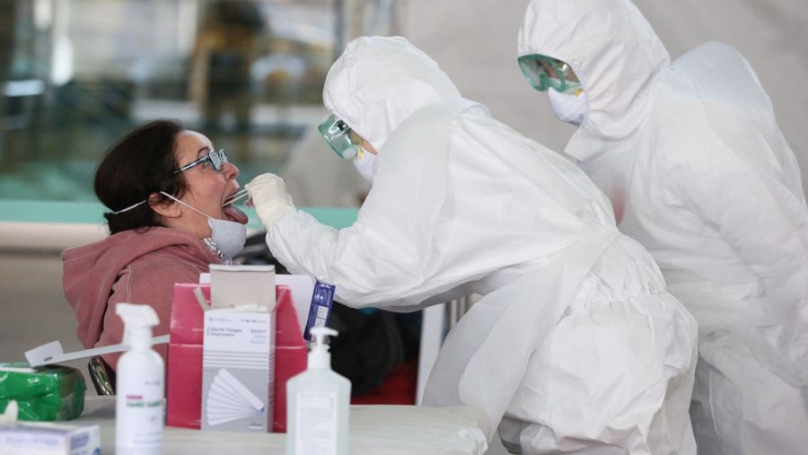 Trabajadores médicos tomando muestras de una visitante extranjera en el aeropuerto de Incheon.