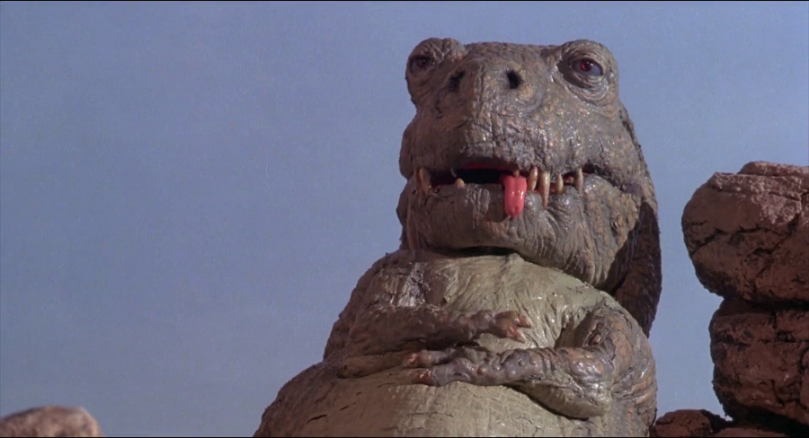 Además de aterrorizarnos, los dinosaurios cinematográficos también han protagonizado momentos muy cómicos. A veces adrede y otras por cutres. "Existe toda una vertiente de cine prehistórico en clave de comedia -comenta Octavio-. Desde esos albores que hemos comentado de los personajes icónicos de Keaton, Laurel y Hardy, hasta llegar a una de las producciones más conocidas como es Cavernícola (1981). Protagonizada por Ringo Starr, tiene además unos dinosaurios por stop-motion hilarantes, en concreto un reptil cuadrúpedo de ojos saltones y un tiranosaurio amorfo que termina bajo el influjo de sustancias psicotrópicas".