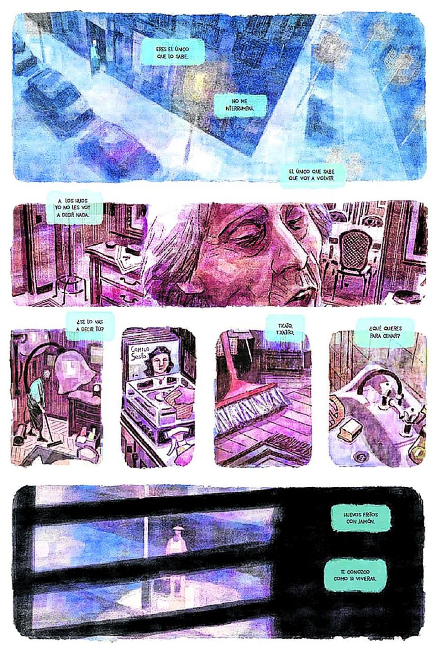 Una de las ideas más originales es que cada personaje tiene un color, como el azul de Bittori o el rojo de Miren, que representan la tristeza y el odio. “Cuando pensé en presentar a los personajes la primera idea fue usar un narrador, pero lo deseché al darme cuenta de que todo se podía contar a través de las imágenes. Por eso decidí poner un color a cada personaje, que está vinculado a su estado emocional y a su función en la novela: la tristeza, la ira, la confusión, la cobardía, la alegría…”