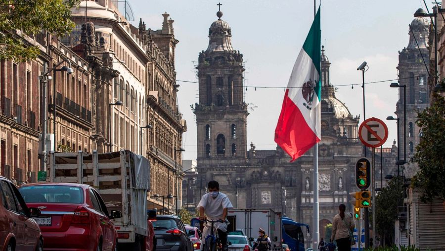 Un hombre montando en bicicleta por el centro histórico de Ciudad de México.