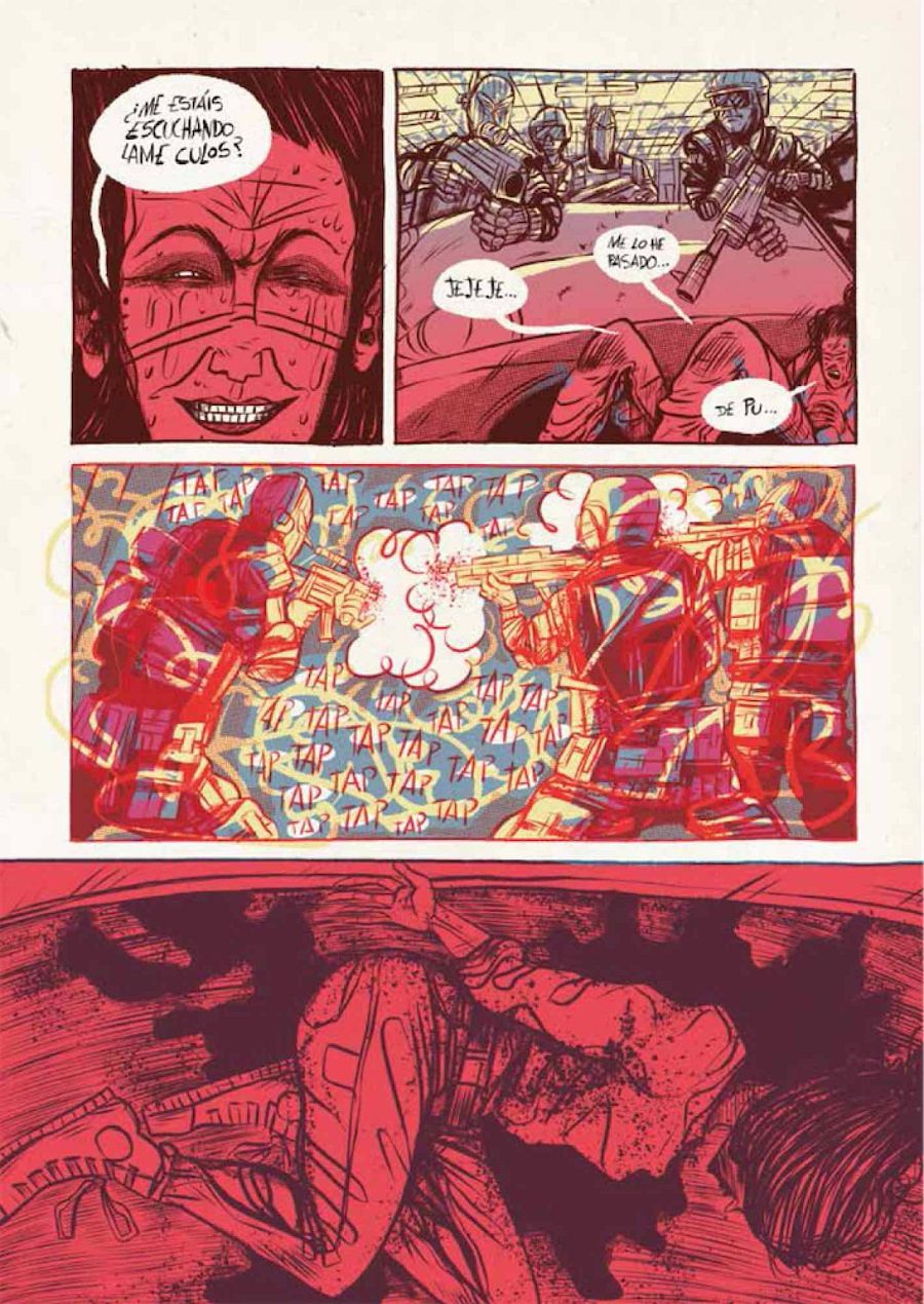 Como decíamos, en su anterior cómic, Desde abajo, ya imaginaba un futuro distópico similar. "Incluso podrían ser el mismo -reconoce-. Ya te digo que simplemente es arrastrar al lector a un sitio donde yo me encuentro a gusto y donde no tengo que dar explicaciones de ningún tipo. Lo utilizo como herramienta para centrarme en la narración, la historia o los personajes que son lo verdaderamente importante para mí. Algunos de los personajes de Desde abajo se podrían colar en Tierra muerta y viceversa".