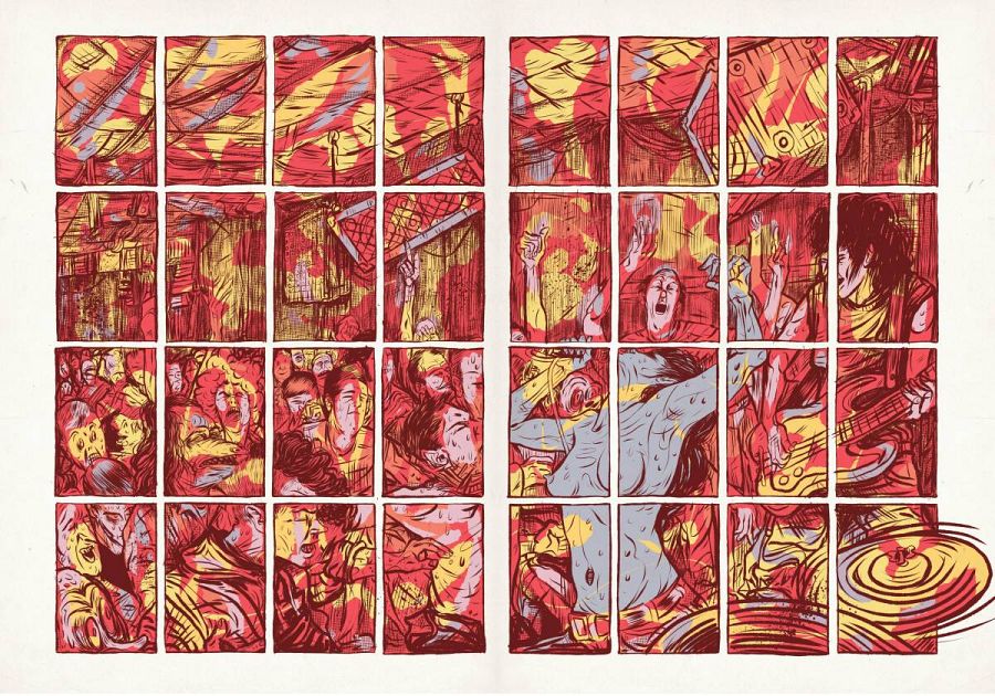 A los que leímos su anterior obra, en un potente blanco y negro, nos sorprende el cambio brutal que ha dado a su estilo con el añadido del color. "Gráficamente -nos cuenta- siempre se me ha relacionado con el underground y eso me encanta, pero si que es verdad que no quería encasillarme en algo anacrónico, en el pasado. Desde luego que mis influencias están ahí, pero me parece que es una evolución personal de ese mundo y no una réplica. Así que con el color he intentado distanciarme un poco de esa parte. También, aunque el barroquismo y la tinta a pozal es marca de la casa, si que es verdad que narrativamente a veces es confuso y el color ayuda mucho como herramienta en esa narración".